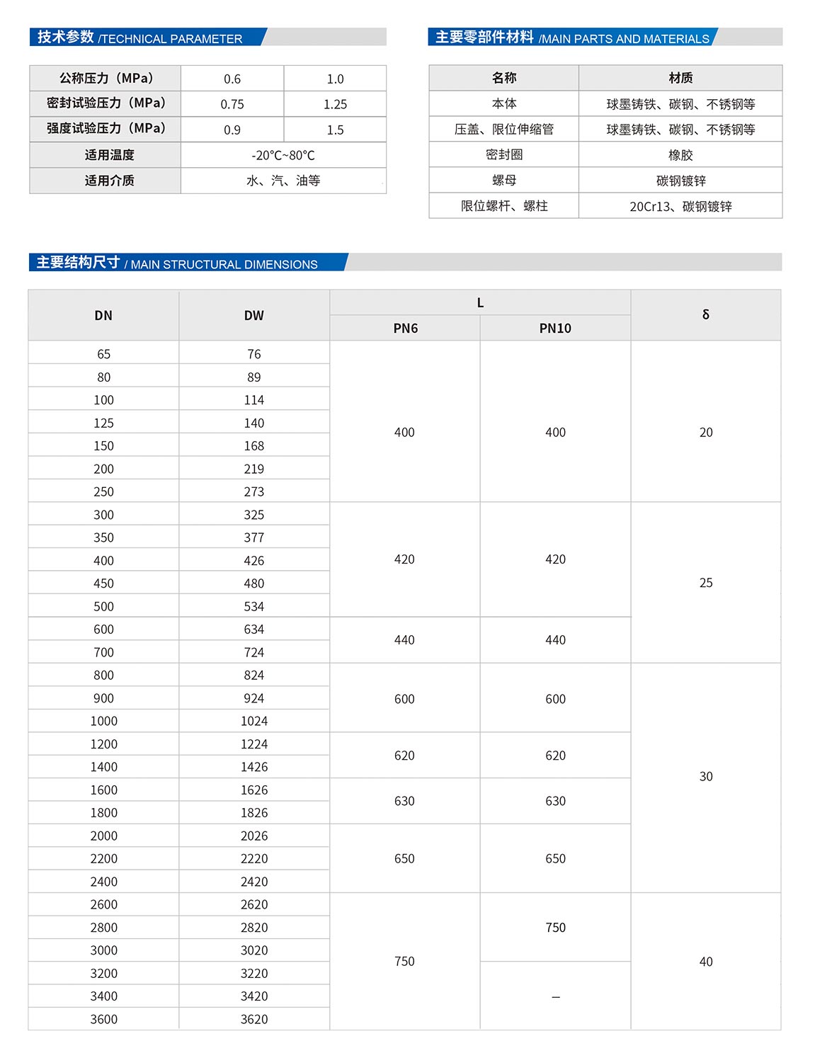 雙法蘭傳力接頭:由本體,密封圈,壓蓋,伸縮短管等主要部件組成。該產(chǎn)品適用于兩邊均為法蘭連接的管道中,安裝時調(diào)節(jié)產(chǎn)品兩端的法蘭的安裝長度,對角均勻擰緊壓蓋螺栓,使其成為一個整體,并有一定的調(diào)節(jié)量,方便安裝維修時,根據(jù)現(xiàn)場尺寸進行調(diào)整。在工作時可以反軸向推力傳遞至整個管道。雙法蘭傳力接頭是由法蘭松套伸縮接頭和短管法蘭,傳力螺桿等構件組成,能降低被連接件的壓力推力(盲板力)和補償管路安裝誤差。雙法蘭傳力接主要用于泵、閥門等附件的松套連接。