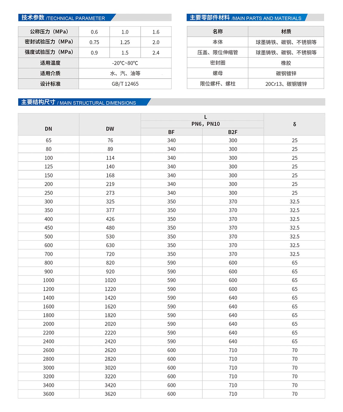 松套限位補(bǔ)償接頭安裝在管道上后,擰緊螺母,起到密封和連接作用。當(dāng)溫度變化時(shí),管子能在接頭中間自由地伸縮,當(dāng)?shù)鼗鲁?、偏斜,它均能確保密封無滲漏,從而達(dá)到自動(dòng)補(bǔ)償之目的。