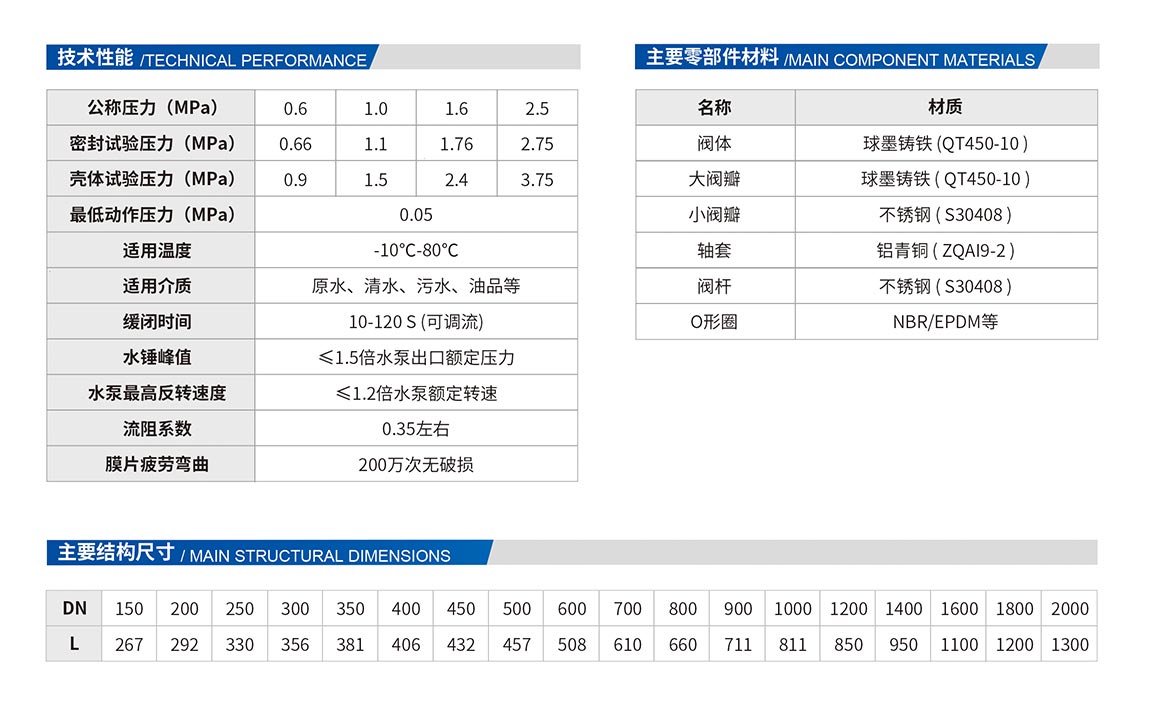 4、安裝在水泵出口管道上,具有關(guān)閥啟泵、關(guān)閥停泵(停泵無水錘)、非人為意外停泵時防止水錘破壞等功能,關(guān)閉時間可調(diào)。